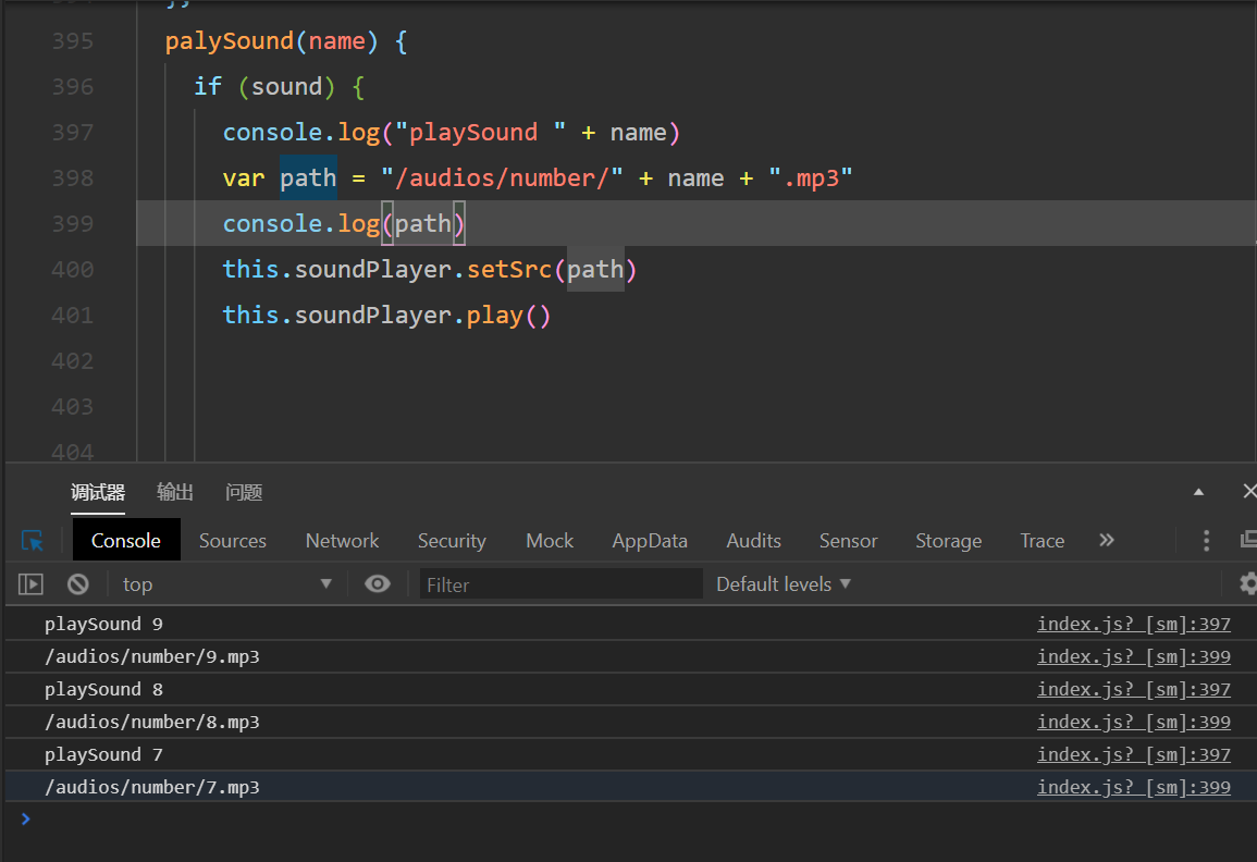 palySound(name) { if (sound) { console.log("playSound " + name) this.soundPlayer.setSrc("/audios/number/" + name + ".mp3") this.soundPlayer.play() }你好,不支持相对路径,根路径开始写是可以的