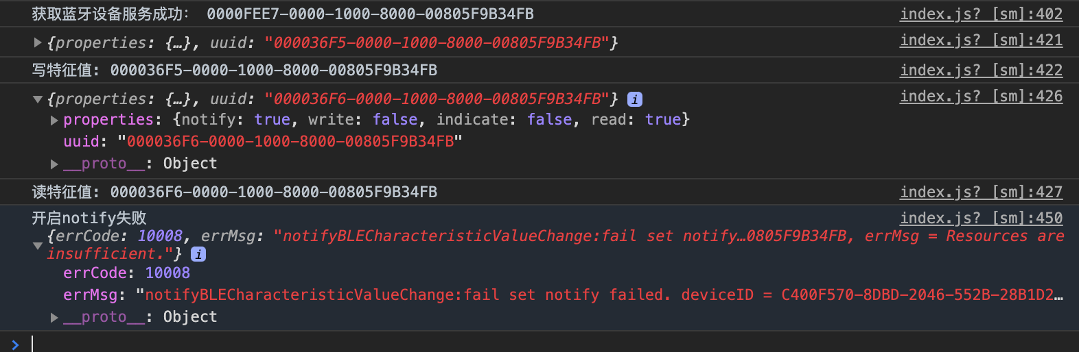 设置特征值通知失败,返回10008;notifyBLECharacteristicValueChange:fail set notify…0805F9B34FB, errMsg = Resources are insufficient.