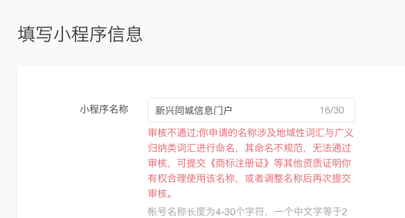 提交了4次都被驳回,公司主体是新兴县内的,小程序使用地方抬头为什么不可以?