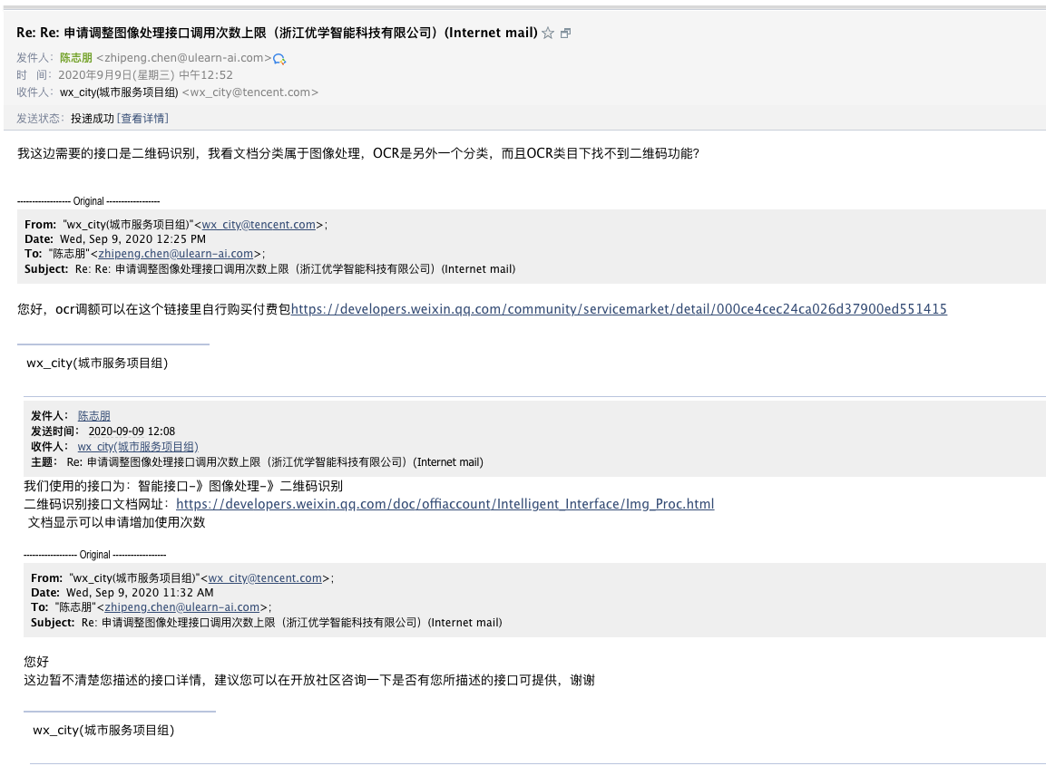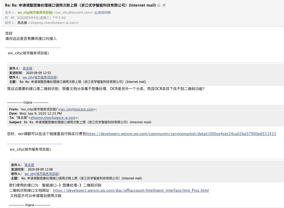 问题3:按照接口文档说明,发送邮件至:wx_city@tencent.com 申请调整,对方却分不清楚OCR与二维码识别?问我有没有腾讯接口对接人?按照邮件回复购买OCR调用次数加油包,咨询客服一天未答复。我以后如果有问题应该向谁提?客户经理?工单?
