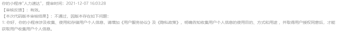 你好,经核实,你的小程序角色认证板块涉及收集、使用和存储用户个人信息,请增加《用户服务协议》及《隐私政策》,明确告知收集用户个人信息的使用目的、方式和用途 ,并取得用户授权同意后,才能获取用户收集用户个人信息。