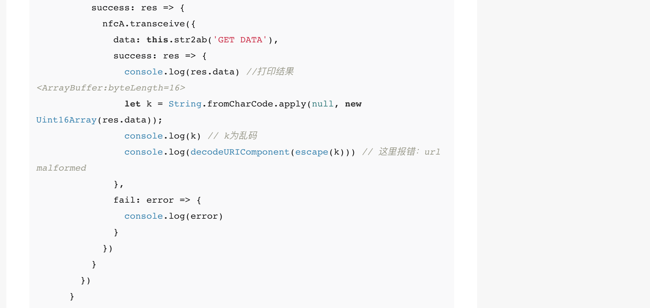 (支持nfc的安卓手机,我用的是华为p30)运行代码,找个nfc的卡片识别,nfcA.transceive返回的结果ArrayBuffer解析成字符串乱码。