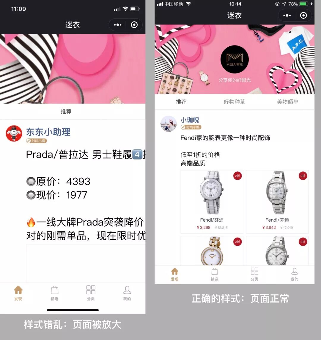 1.头像那里使用px;头像旁边的昵称也是使用px;昵称下的时尚小编也是使用px; 其他有使用rpx的页面也同样是有放大的问题(如下图的商品图片)。 2.没有开启横屏(pageOrientation字段)。 3.第三点不成立。删除小程序后重新进入时,页面是正常的,随便点开一个页面后再点返回,页面就会被放大。 4.第四点也不成立,打开占内存较小的页面后返回也是出现页面放大问题。 5.目前在其中一个用户的手机端复现概率比较大,问题在两个月前开始出现,客户最近才给我们反馈。