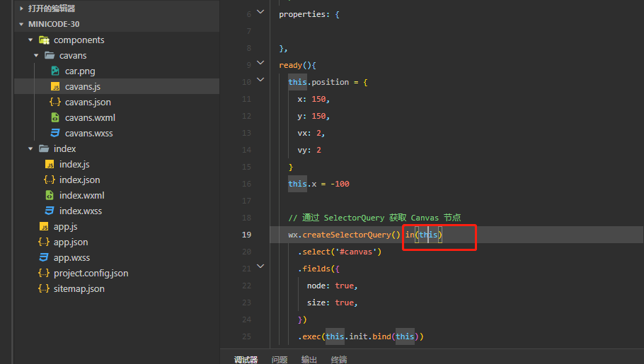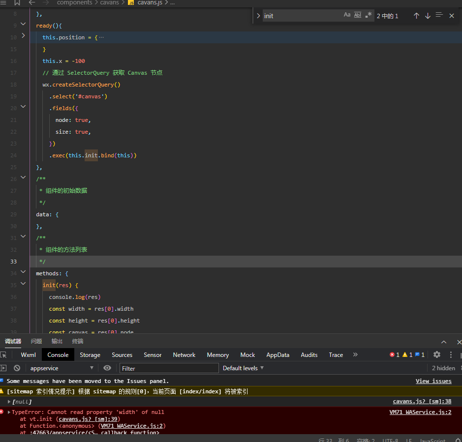 问题:canvas 2d,引入到组件化里面去就报null,用同样的方法不在组件里面使用就不报错误。