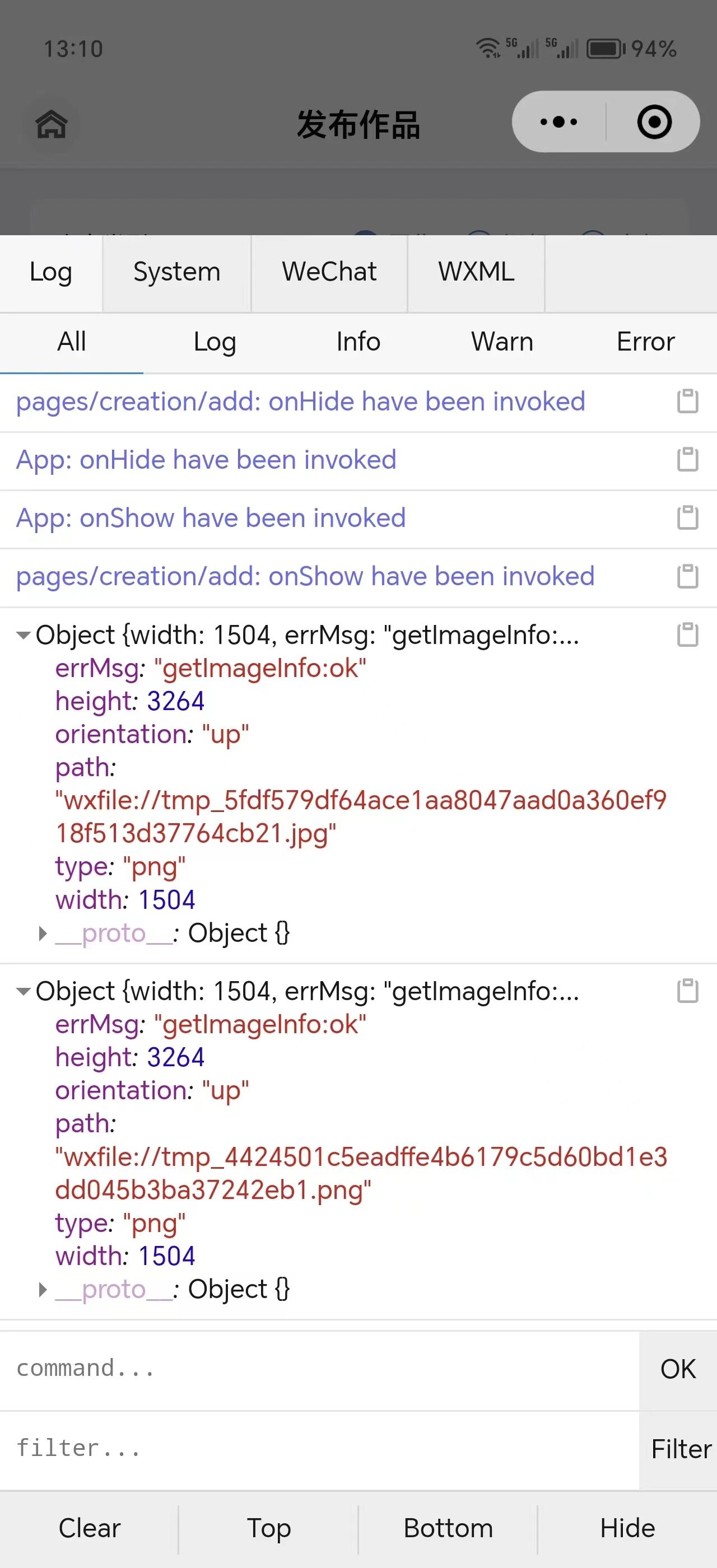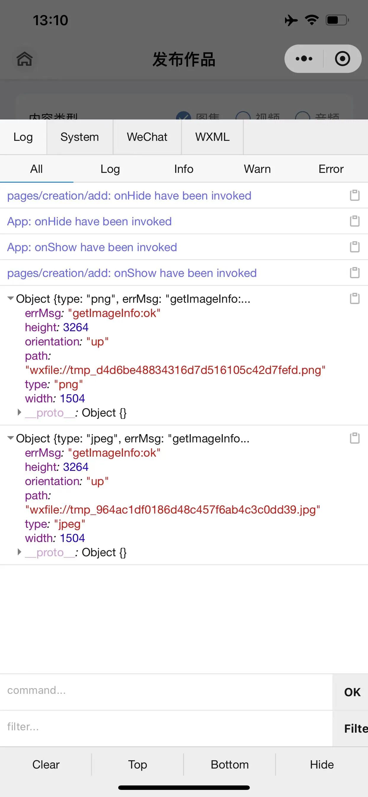 第一个Object是chooseImage后获取的图片信息,可以看到ios端是正常的,而安卓端path的后缀变成了jpg。