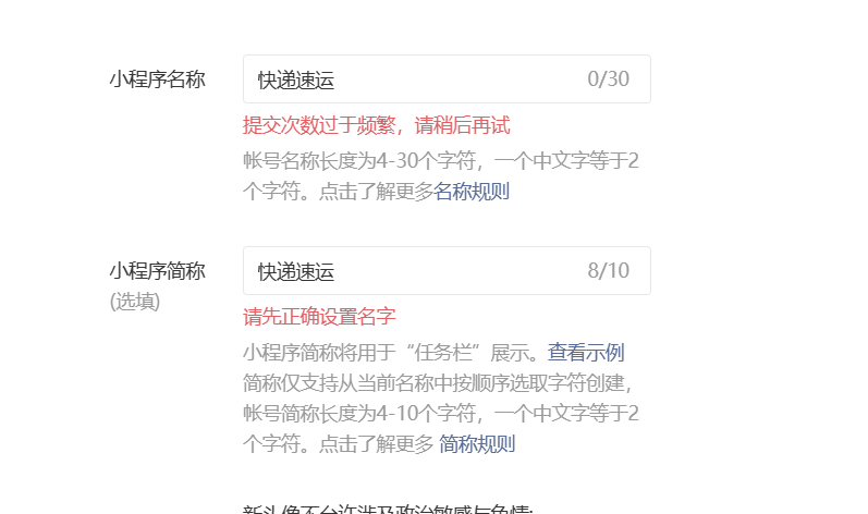 小程序名称要提交老是报“提交次数过于频繁,请稍后再试”?