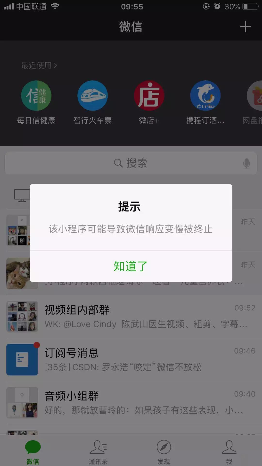 用户在使用过程中,偶尔会出现小程序闪退现象,并提示“该小程序可能导致微信响应变慢被终止”文字