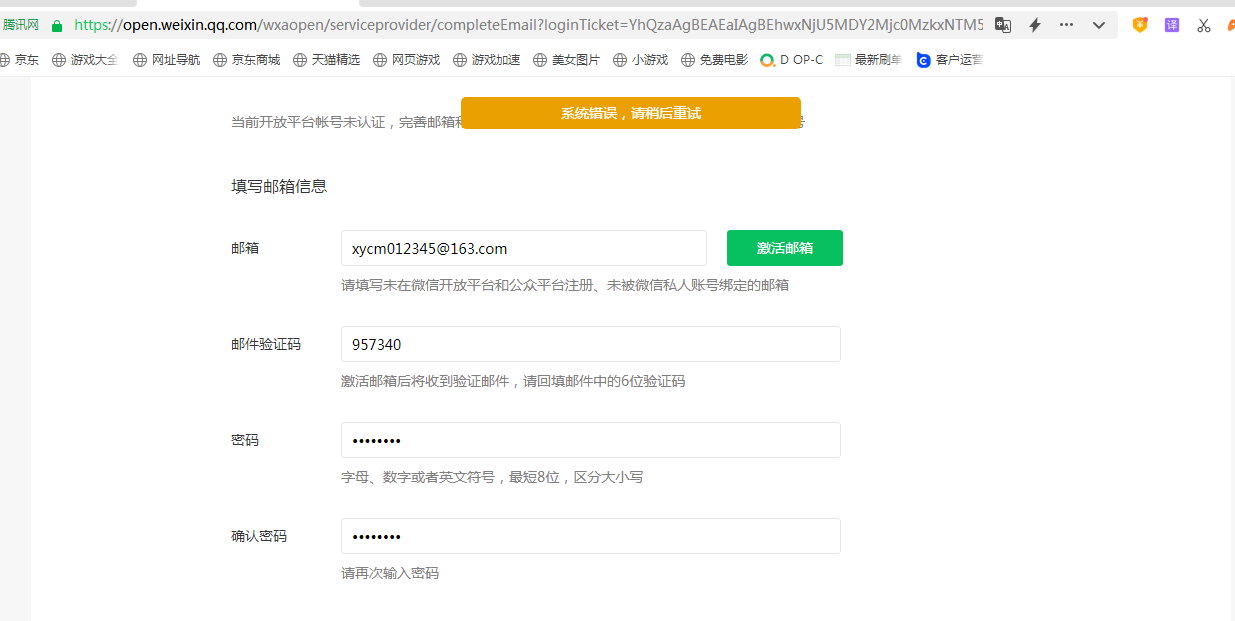 在给开放平台账号做完善信息-认证的时候提示系统报错;