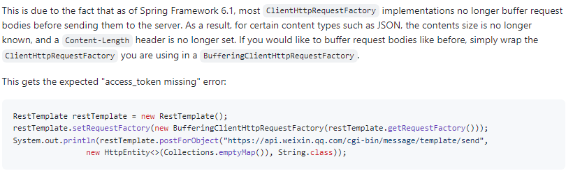 @Bean public RestTemplate restTemplate() { RestTemplate restTemplate = builder .setConnectTimeout(Duration.ofSeconds(15)) .setReadTimeout(Duration.ofSeconds(15)) .build(); configureMessageConverters(restTemplate); return restTemplate; }参见楼下的解释,其实是微信会检查Content-Length参数,但Spring Framework 6.1以后请求不再设置该参数(可以参加SimpleClientHttpRequestFactory中的setBufferRequestBody说明);另外可以debug看一下请求报文中的{Transfer-Encoding: chunked}