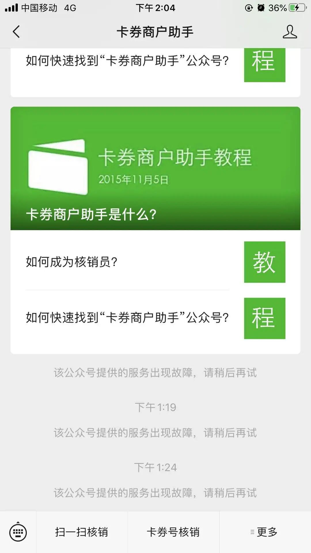 今天上午核销卡一直提示是该公众号提供的服务出现故障,请稍后再试,是啥情况?卡卷商户助手公众号是不是出现问题了