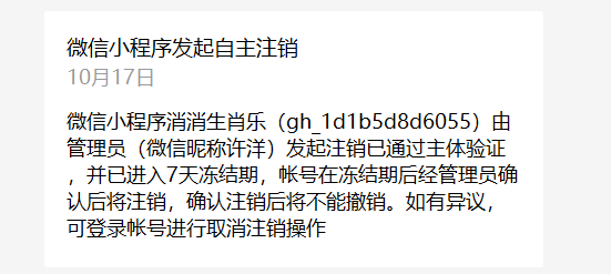 管理员您好,我们订阅号申请注销但一直没有收到推送给管理员得注销通知,第一次7天没收到,这一次又没收到