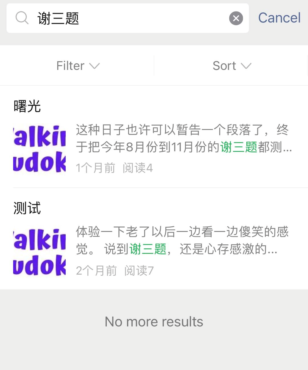 我用号内搜索,用“谢三题”搜出来的结果明显不正确,搜不到标题含“谢三题”的帖子,但是用“谢”字搜索却能查到这些帖子。