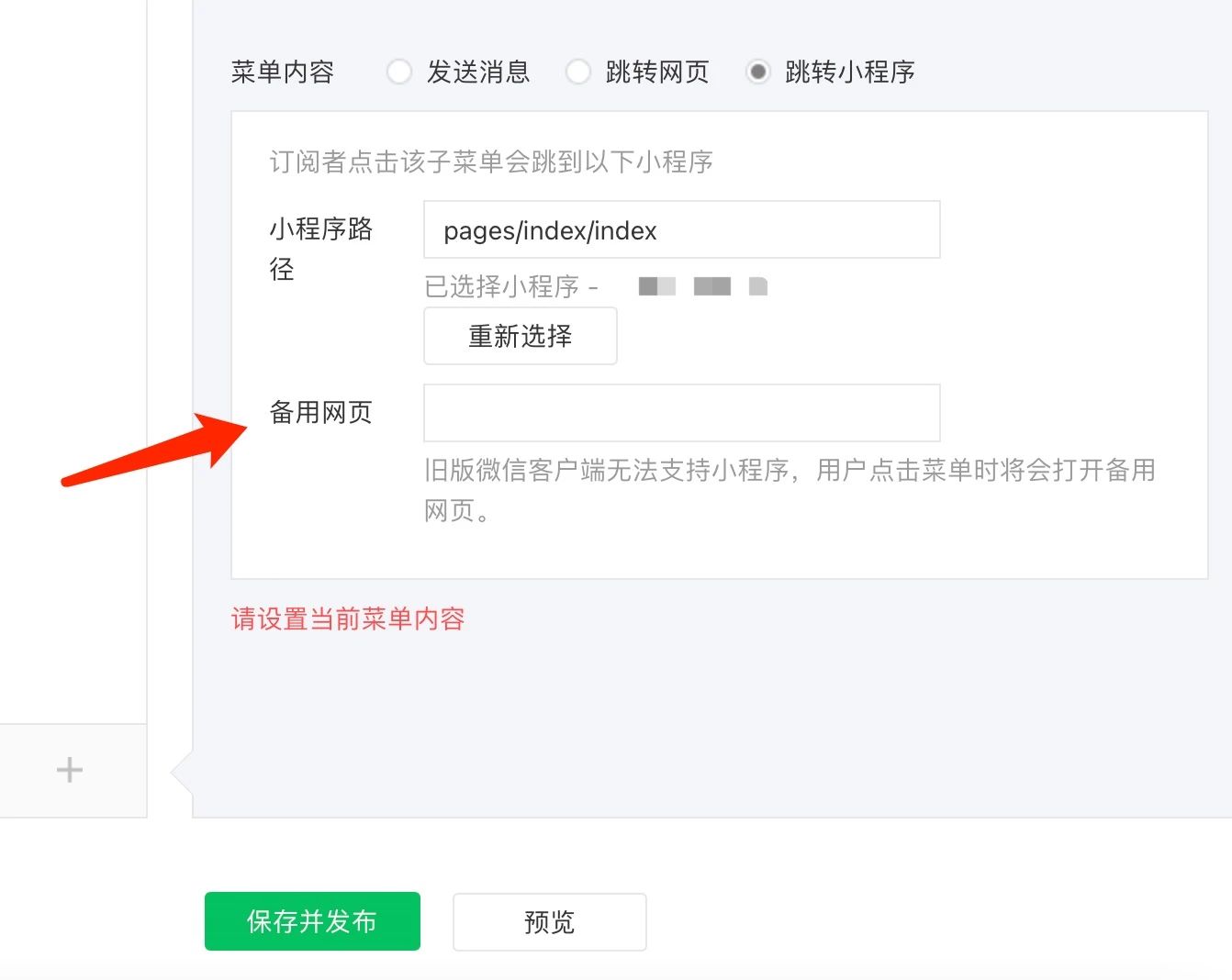 微信小商店的小程序接入公众号自定义菜单,需要提供备用网页怎么获取啊?