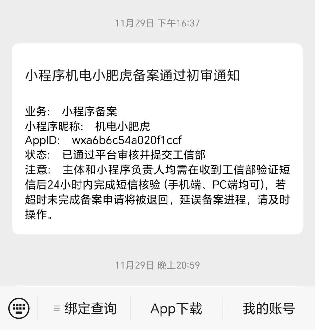 进入小程序后台在设置--》备案那查看备案状态,可能是平台判断你初审通过,已经进入管通局审核中了