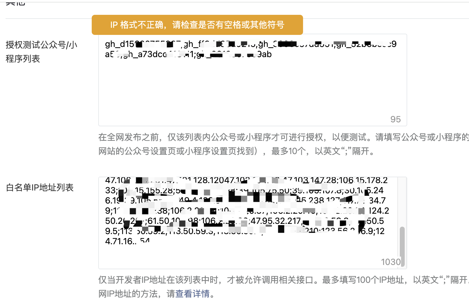 进入第三方平台开发配置之后,添加了一个业务域名,没有改动白名单,直接保存,提示