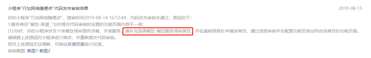 官方的同学,可以给点提示信息吗,我们是一个网络公司,给下属的餐饮公司开发了一套点餐用的小程序,在添加服务类目的时候出现了问题。一次递交了三份资料(《餐饮平台与门店的管理关系声明》和《旗下门店名单和对应门店的卫生许可证》和《微信小程序餐饮门店运营资质和责任承诺函》),没有通过审核。