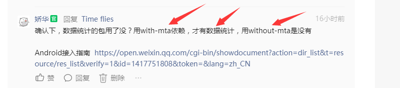 确认下,数据统计的包用了没?用with-mta依赖,才有数据统计,用without-mta是没有Android接入指南 https://open.weixin.qq.com/cgi-bin/showdocument?action=dir_list&t=resource/res_list&verify=1&id=1417751808&token=&lang=zh_CN