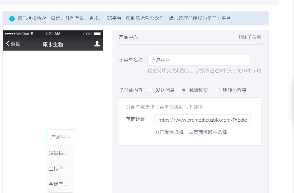 2)每个一级菜单下的子菜单最多可创建5个,子菜单名称名字不多于8个汉字或16个字母。