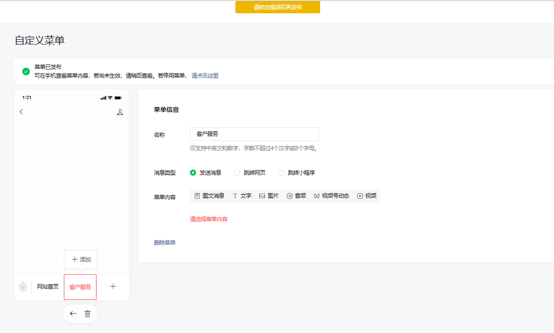 温馨提示:编辑中的菜单不会马上被用户看到,点击发布后会在24小时内在手机端同步显示,粉丝不会收到更新提示,若多次编辑,以最后一次保存为准。