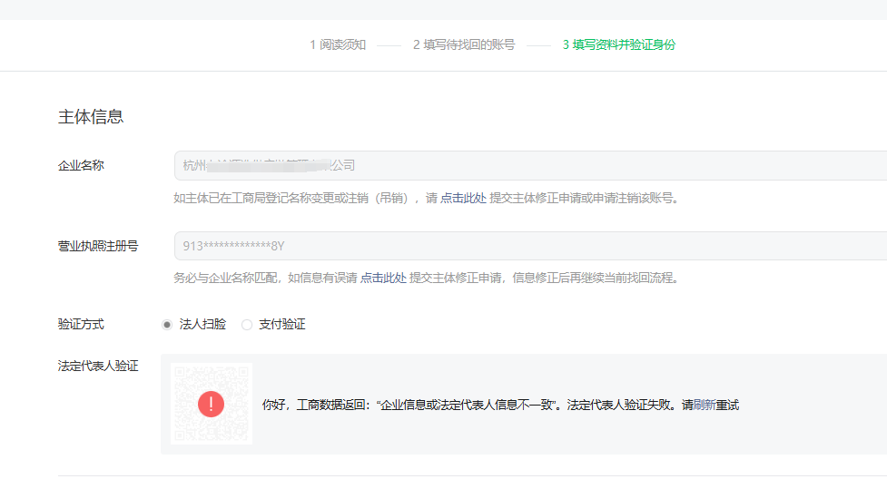 微信扫码刷脸认证的时候弹出 “你好,工商数据返回:“企业信息或法定代表人信息不一致”。法定代表人验证失败。请刷新重试。” 什么个情况这。资料都反复一字一字查过几遍了