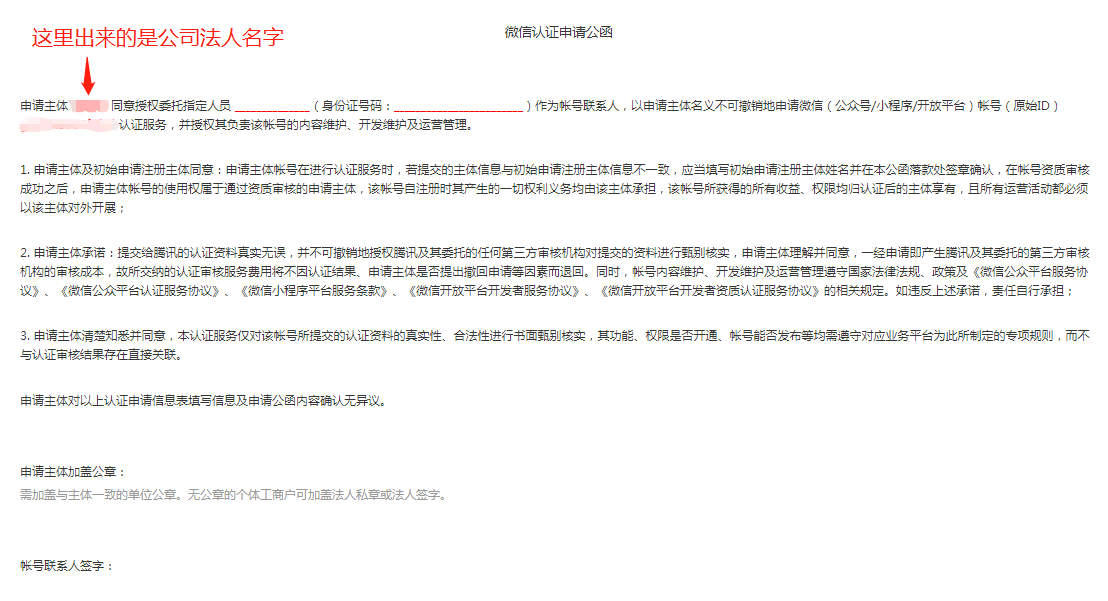 问题1、我注册小程序时,主体验证选的是法定代表人验证方式(图一),然后现在要微信认证主体真实性,然后微信认证申请公函的申请主体是法人的姓名(图二),申请主体不是公司名来的吗?非常感谢回复!