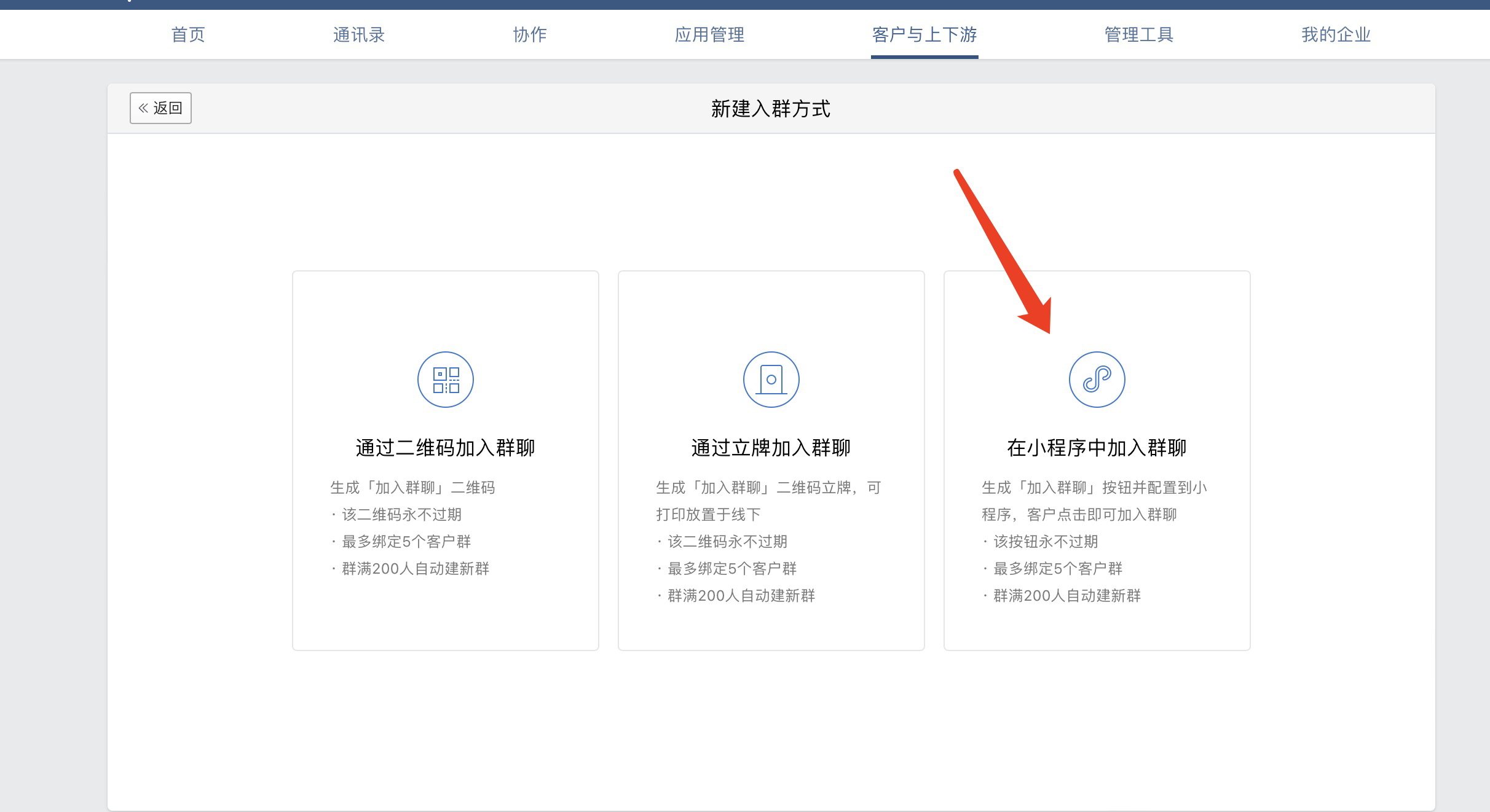看到别人帖子也是这个问题并没有给出答案: https://developers.weixin.qq.com/community/develop/doc/000ce6039f8b3060d8ac5e25c56400?highLine=%25E4%25BC%2581%25E4%25B8%259A%25E5%25BE%25AE%25E4%25BF%25A1%25E7%25BE%25A4%25E8%2581%258A
