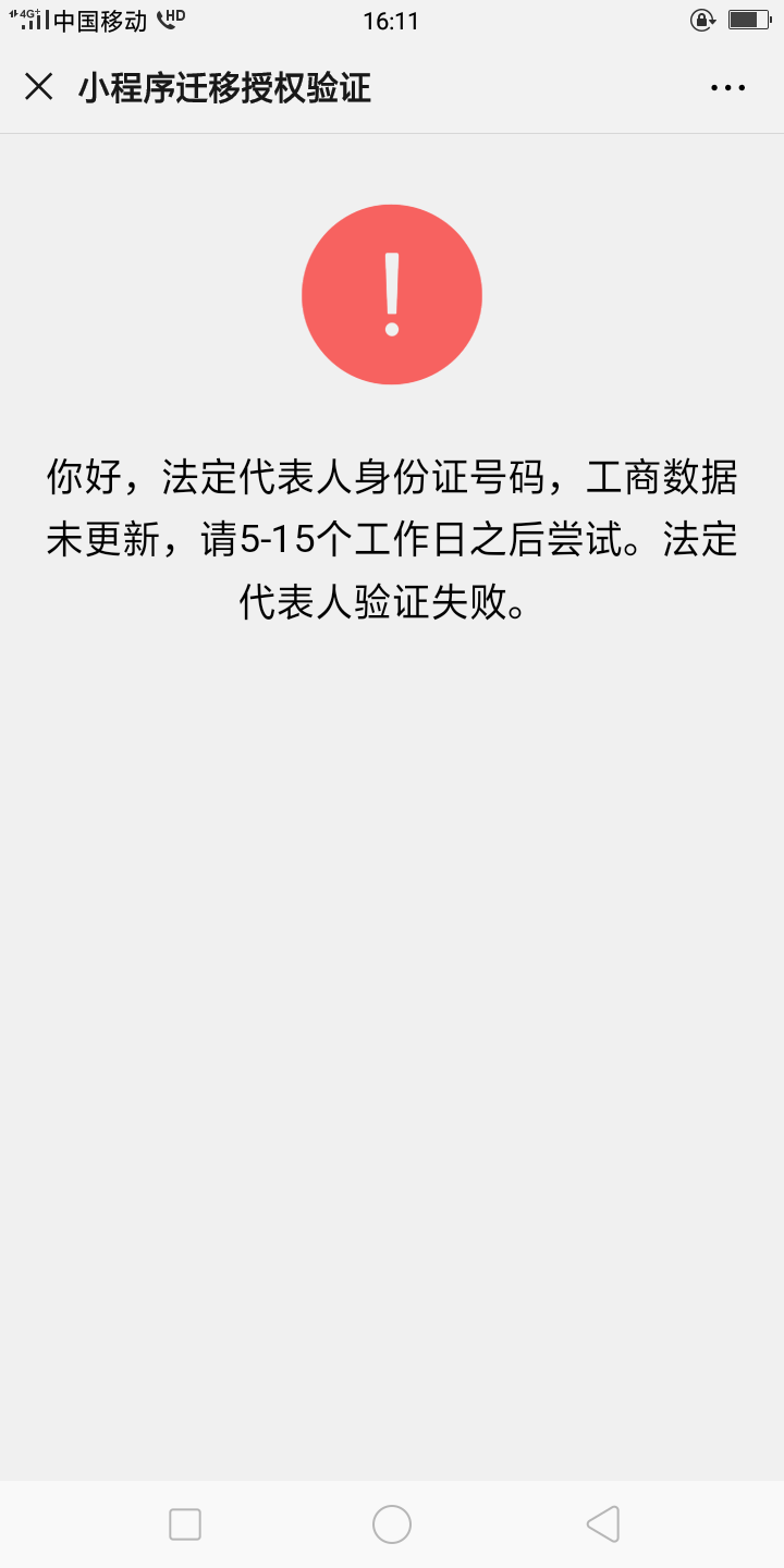 公司小程序因为公司名称(营业执照更新)变更,要变更小程序主体信息,只能通过迁移完成嘛。然后原主体是老的信息,目标主体是当前更新后的。但是在授权验证的时候,出现了这个问题。