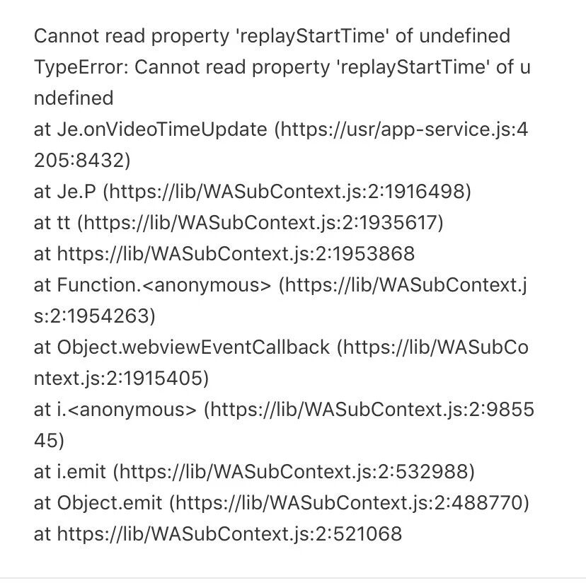 MiniProgramError Cannot read property 'replayStartTime' of undefined TypeError: Cannot read property 'replayStartTime' of undefined at Je.onVideoTimeUpdate (https://usr/pages/live/app-service.js:4204:8432) at Je.P (https://lib/WASubContext.js:2:1918679) at tt (https://lib/WASubContext.js:2:1937798) at https://lib/WASubContext.js:2:1956049 at Function. (https://lib/WASubContext.js:2:1956444) at Object.webviewEventCallback (https://lib/WASubContext.js:2:1917586) at i. (https://lib/WASubContext.js:2:985544) at i.emit (https://lib/WASubContext.js:2:533069) at Object.emit (https://lib/WASubContext.js:2:488851) at https://lib/WASubContext.js:2:521149