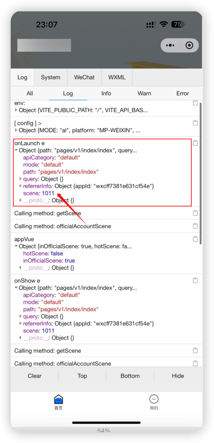 从开发者助教进入业务小程序打印入口参数,观察scene值就可以复现