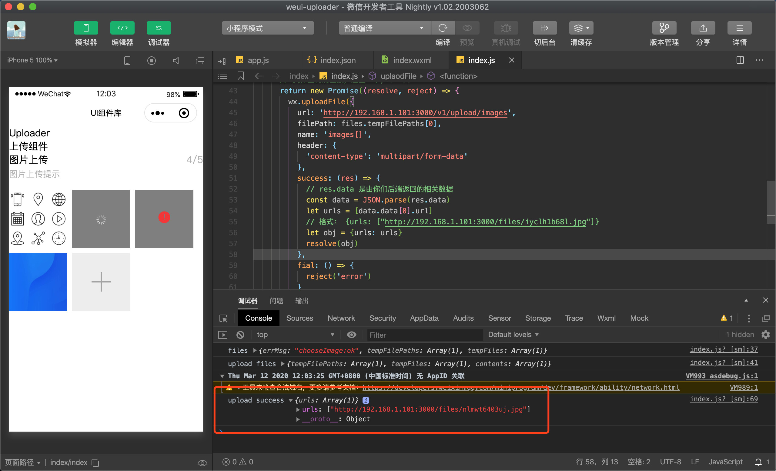 <mp-uploader ext-class="mp-uploader" bindfail="uploadError" bindsuccess="uploadSuccess" files="{{form.uploadPhoto.file}}" max-count="10" delete="{{true}}" sizeType="['original', 'compressed']" source-type="['album', 'camera']" upload="{{uploadFileHandler}}"></mp-uploader>控制台在选择完图片后就输出: