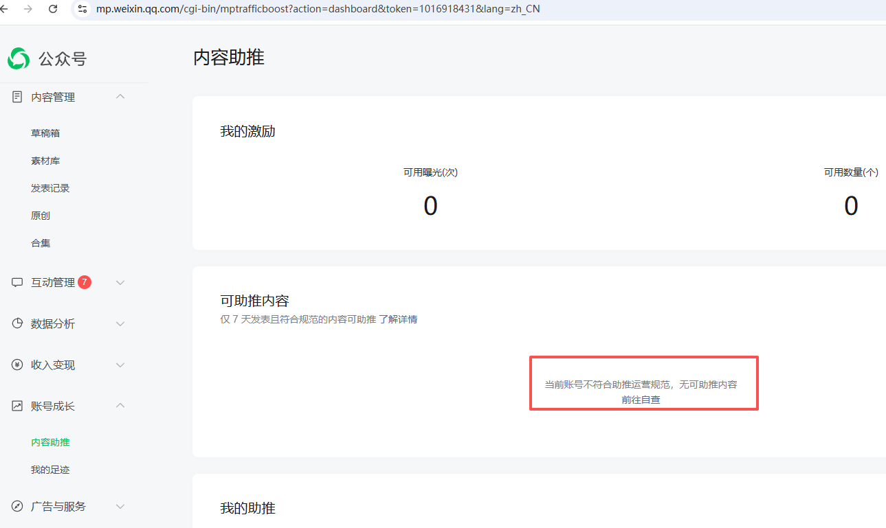 如图中红线方框内信息所示。想了解一下为什么我的公众号账户不符合助推运营规范呀?我应该如何解决这个问题呢?给您添麻烦了