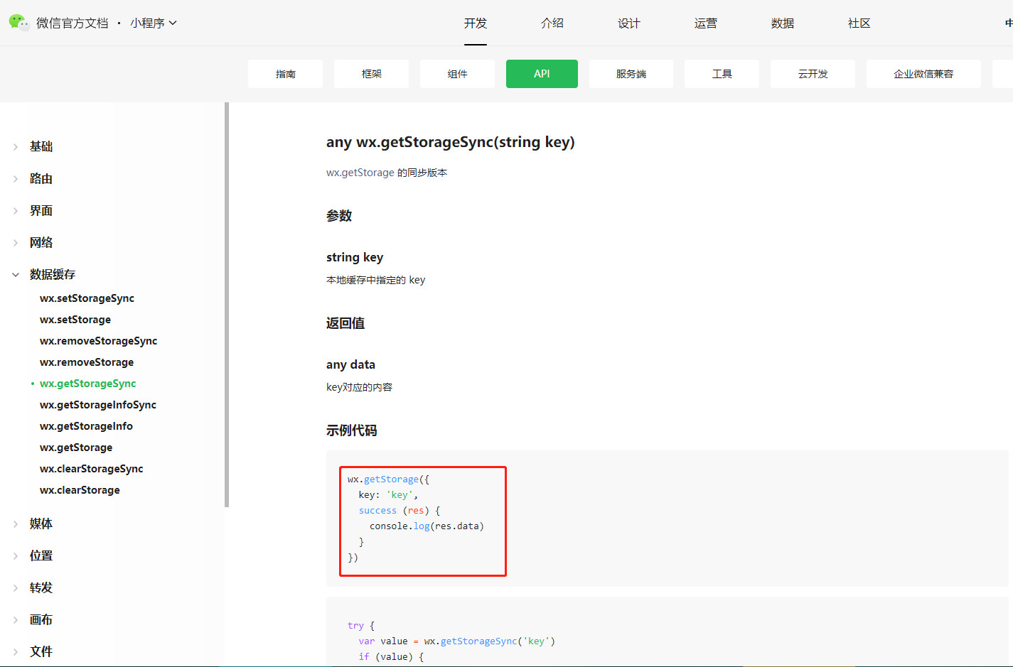 文档示例代码应该是wx.getStorageSync而示例为wx.getStorage.
