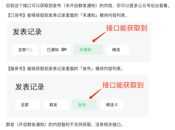 目前和以前一样的,能获取到发布的列表,群发列表暂不支持获取(目前没有相关接口,你上面的那个说可以获取群发列表的是「获取永久素材列表」,并不是获取群发列表的接口)。
