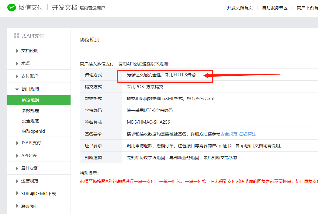 我看文档写的是:为保证交易安全性,采用HTTPS传输。