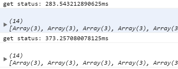 console.time('get status')let statusRes = await getStatus(placeId)console.timeEnd('get status') |