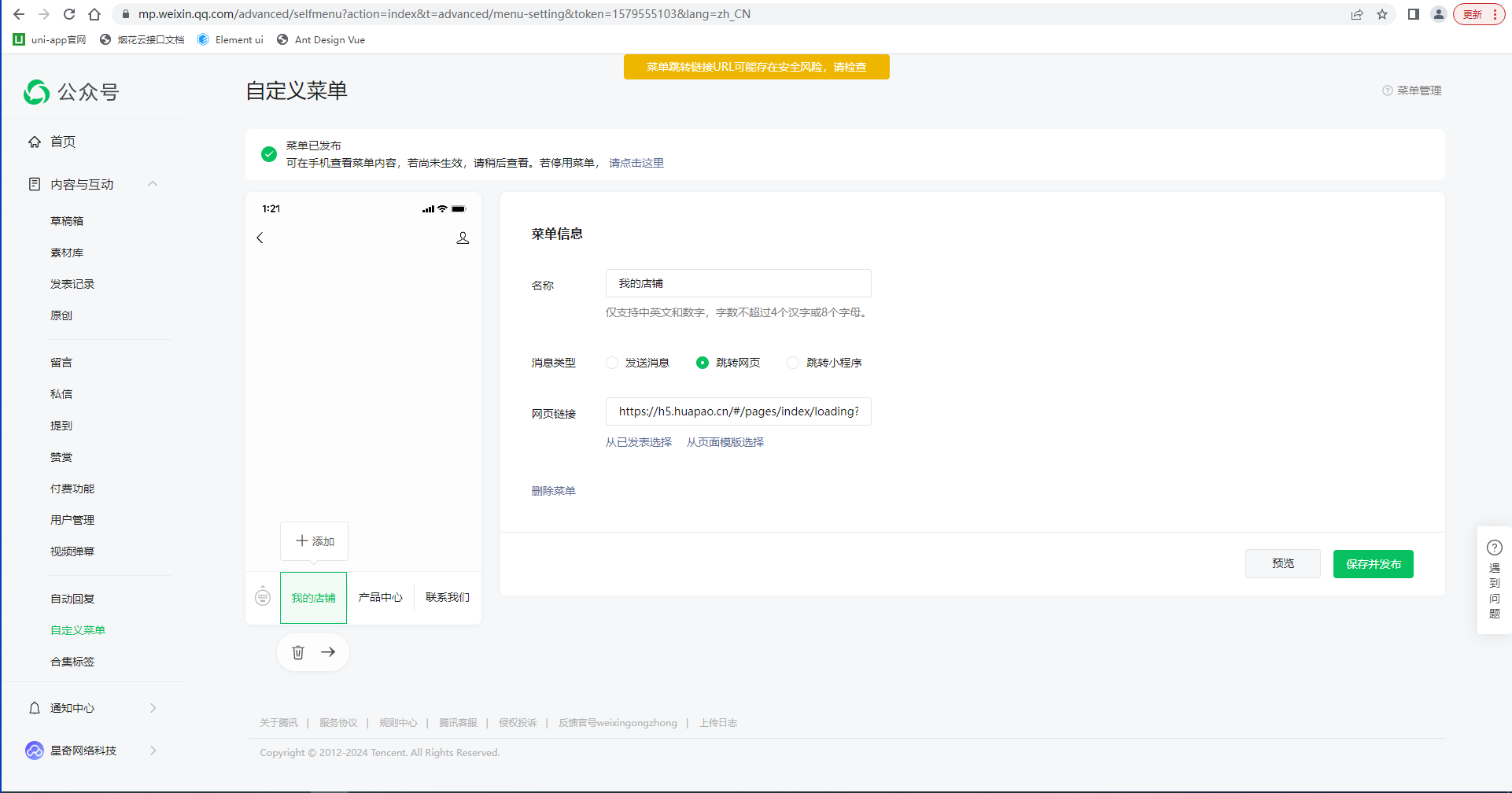 在开发调试公众号卡片式分享过程中,由于分享多次,微信浏览器提示已停止访问该网页。按照申请恢复访问流程,已提交申请。微信公众号自定义菜单栏提示:菜单跳转链接URL可能存在安全风险,请检查。