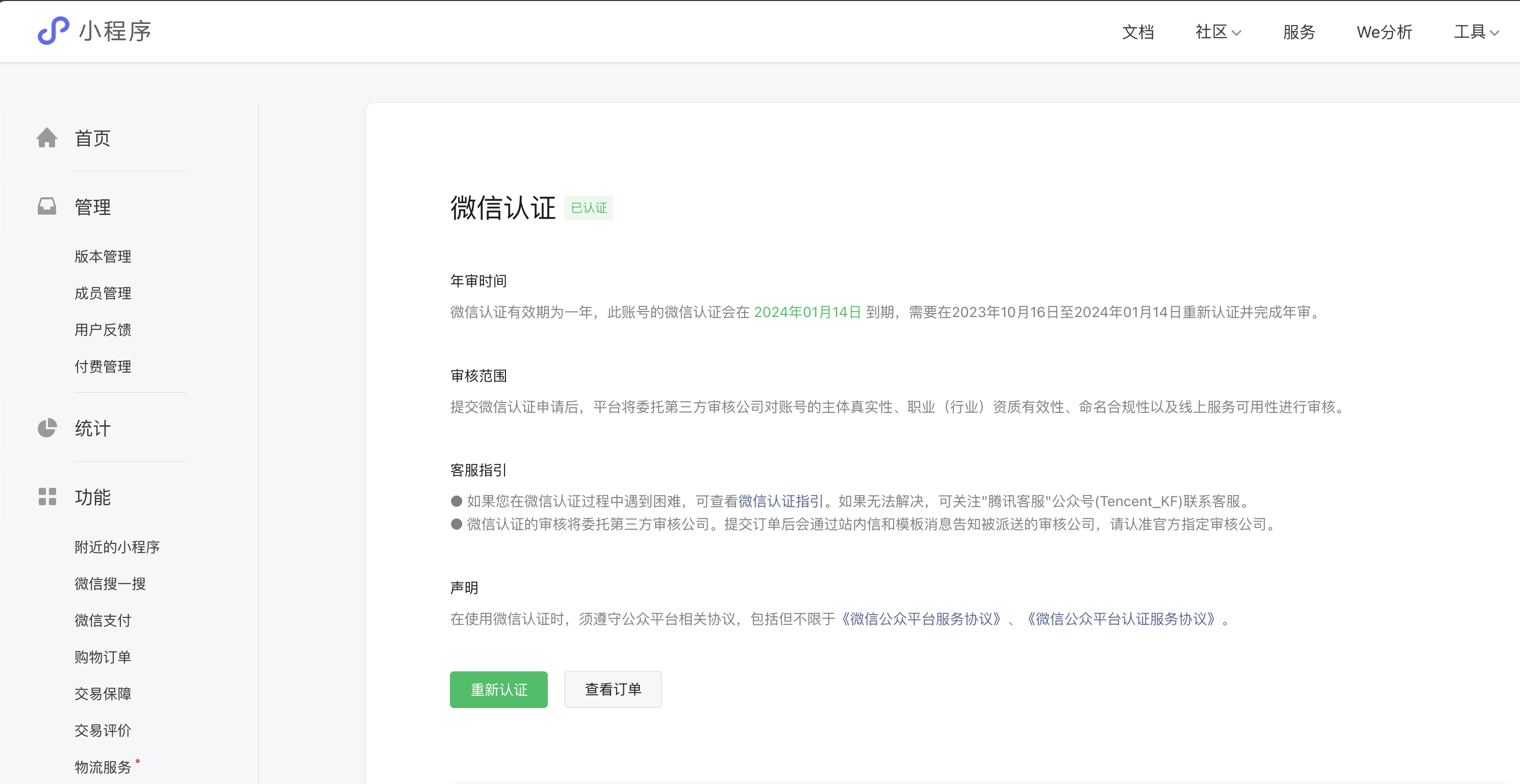 问了官方客服,说是“当前10 月 25 日 后注册的小程序账号,微信认证需年审。10 月 25 日前注册的小程序账号不受本次调整影响。”