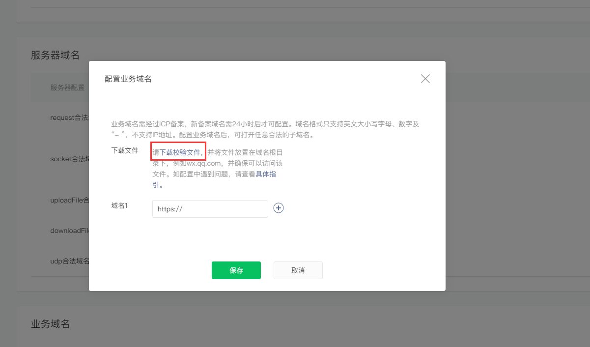 下载txt校验文档,并配置到小程序绑定业务域名根目录底下。