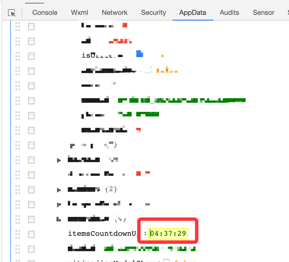图1,是开发工具AppData的panel的截图其中,itemsCountdownUi是一个倒计时的data名,每一秒会被setData的api改变,每次setData时,AppData的panel就会focus聚焦到这个data后面的input上,input会变为黄色,如图所示。