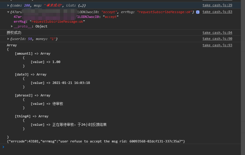 在小程序开发中,提现的时候需要为用户发送提现消息提醒,每次点击提现按钮都会订阅消息,用户授权之后调用服务端接口发送一条通知,从发送通知的时候就一直报43101错误,提示用户拒绝订阅