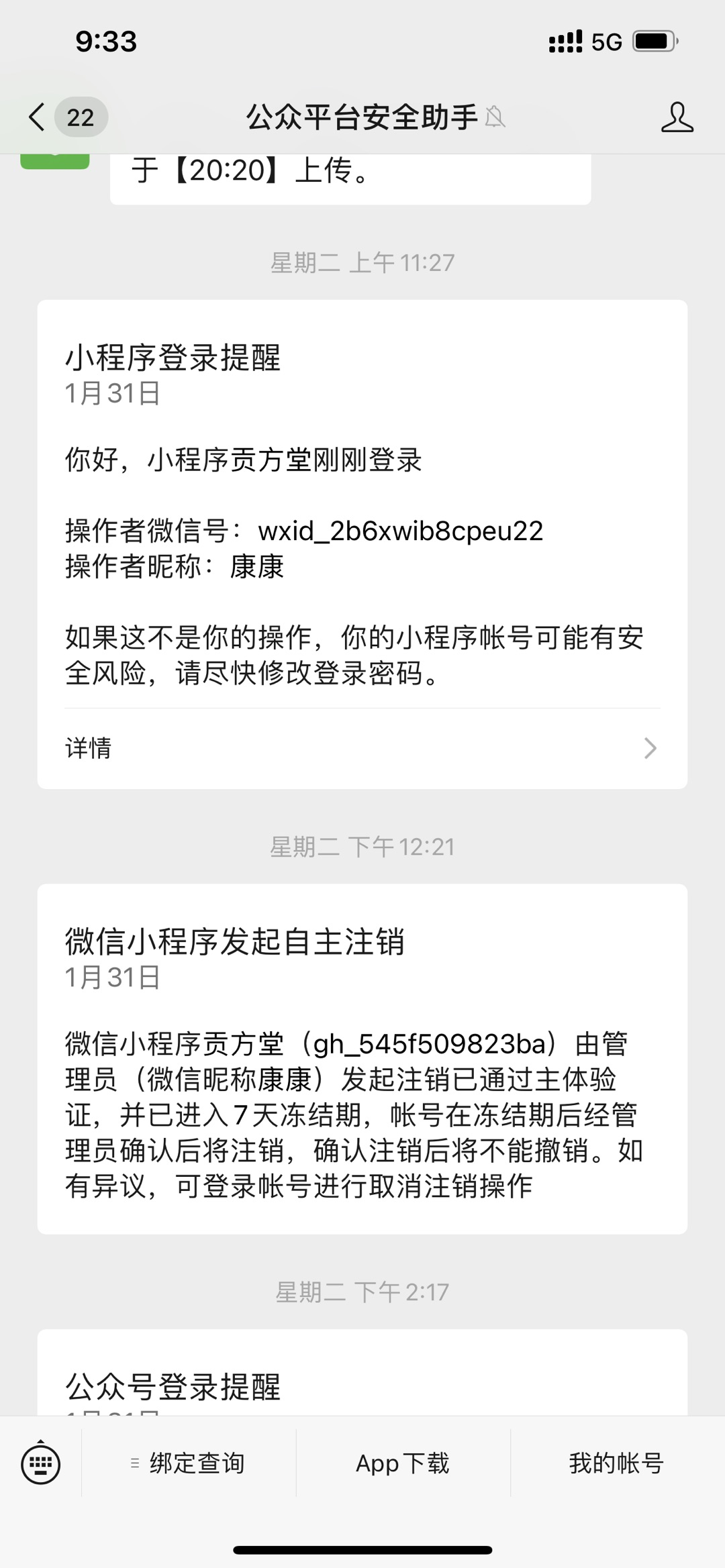 管理员您好,申请注销已经第七个工作日,麻烦重新发个通知,我已经关注了公众平台安全助手,但是还是收不到确认取消的通知。