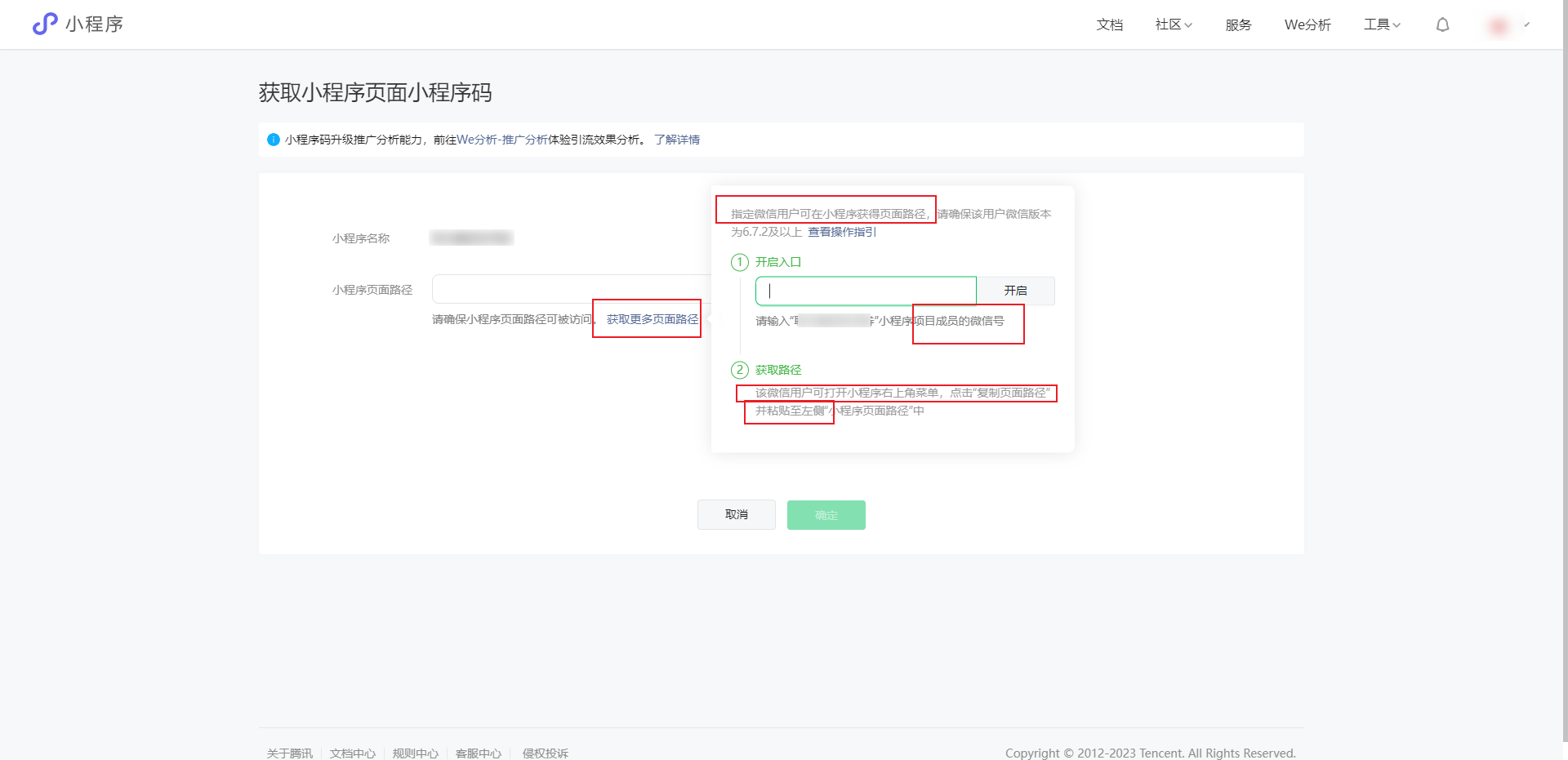 在上面填写你的微信号后点击开启,手机上访问当前小程序,进入到你需要的那个页面上,点击右上角三个点,最下方最右边有个「复制页面路径」的按钮,点击下就把当前页面的路径复制出来了,就可以粘贴到上面生成指定页面的小程序码了。