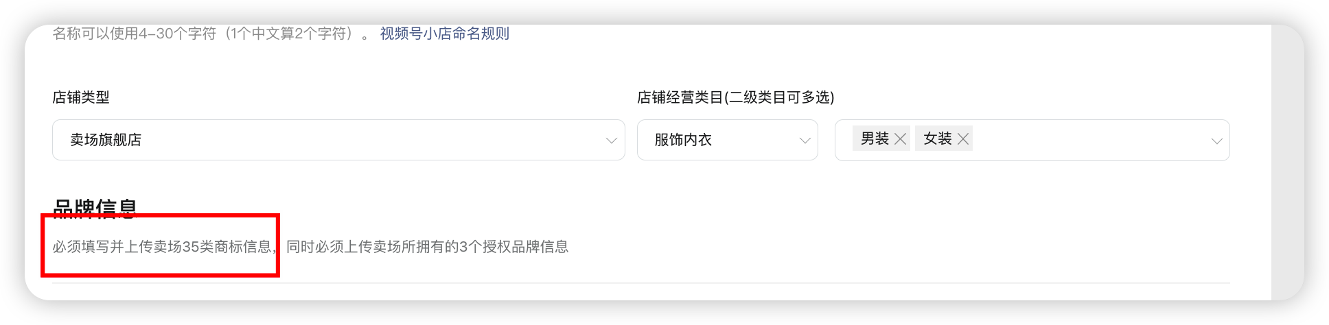1、在提审小店时,需要先选择品牌授权类型,【卖场】需要35类商标+3个品牌授权;