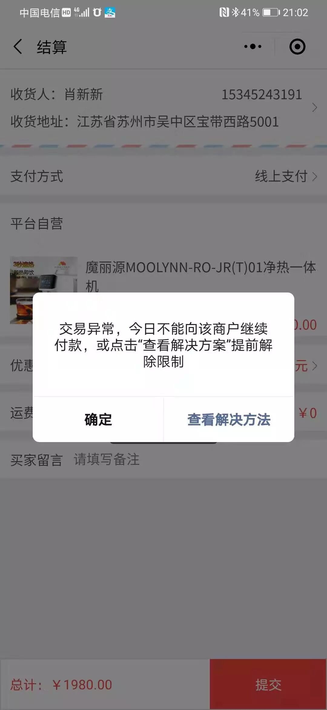 用户付款时候提示内容:交易异常,,今日不能向该商户继续付款或点击"查看解决方案"提前解除限制