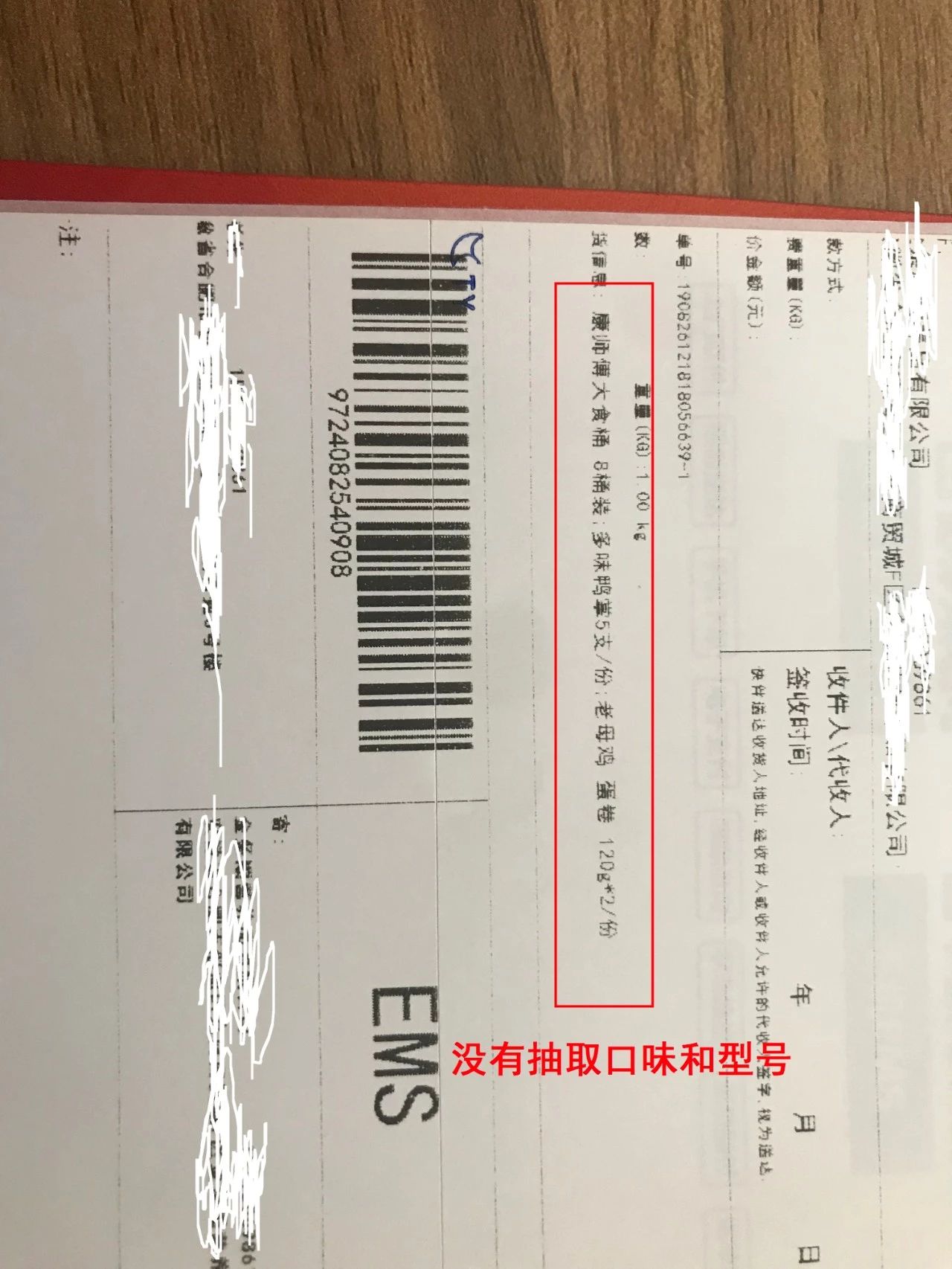 还有需要一个调试的地方,打印出来的面单抽取的信息不完整。在货品信息一栏中,没有把口味、型号抽取上,仅抽取了商品名称,如图: