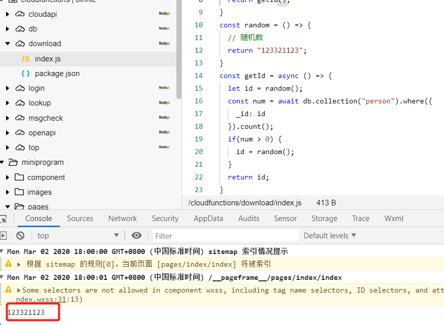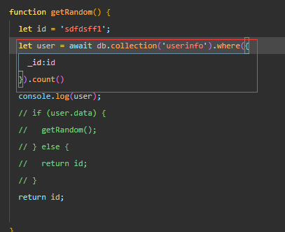 想在云函数内写一个自定义生成8位随机数的_id 的函数,这个函数要同时访问数据库,判断生成的随机id是否重复。如下图: