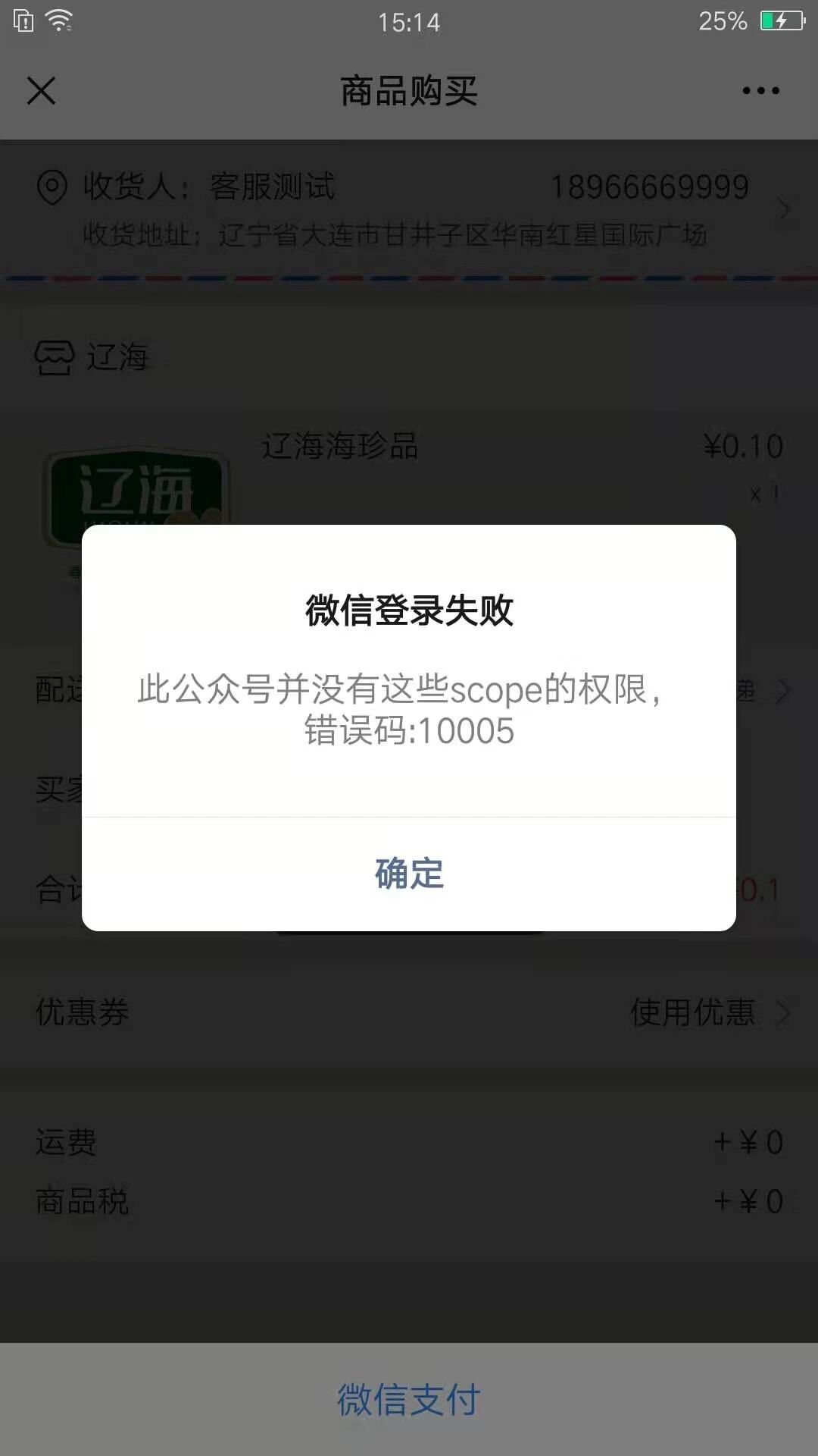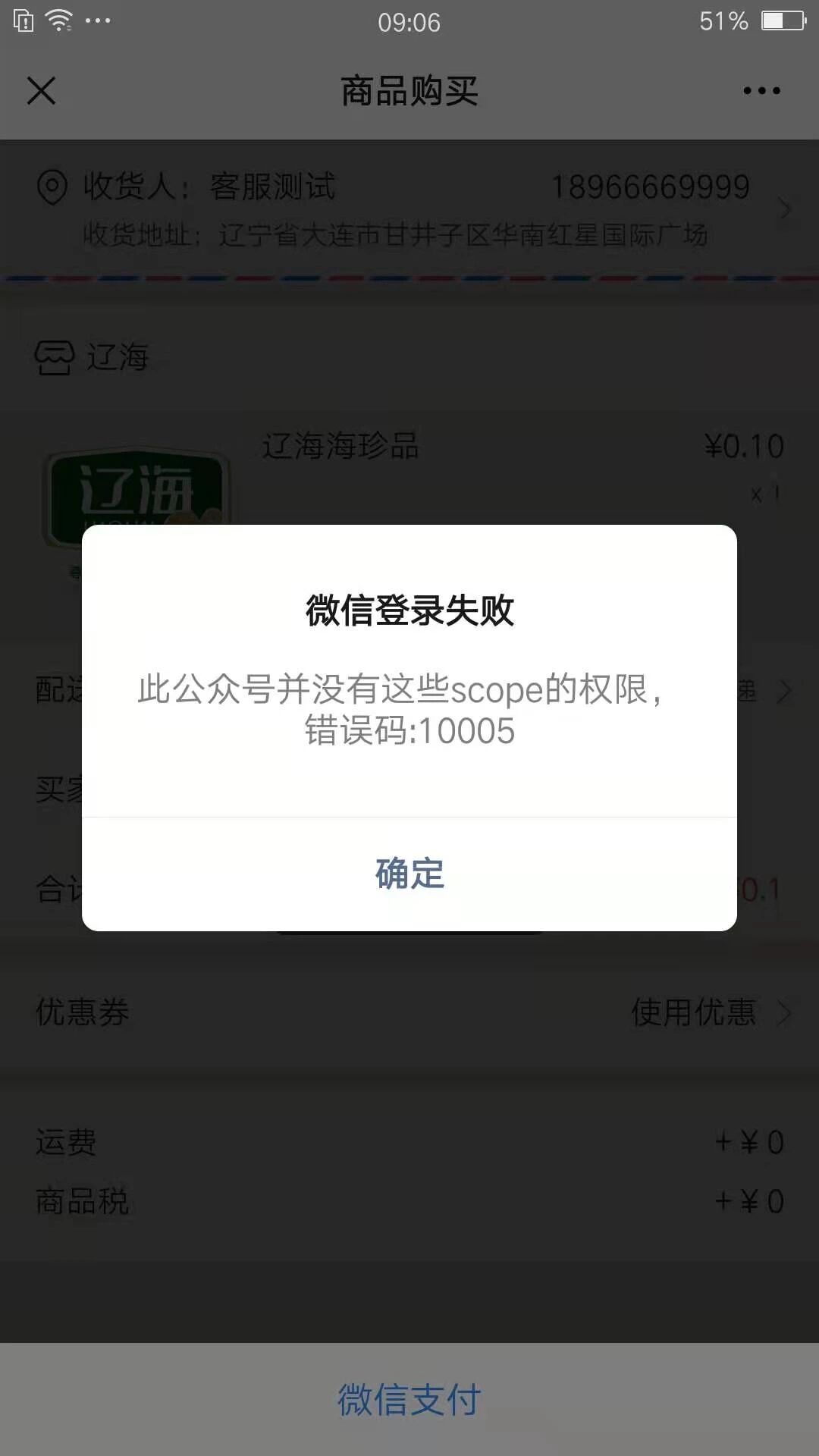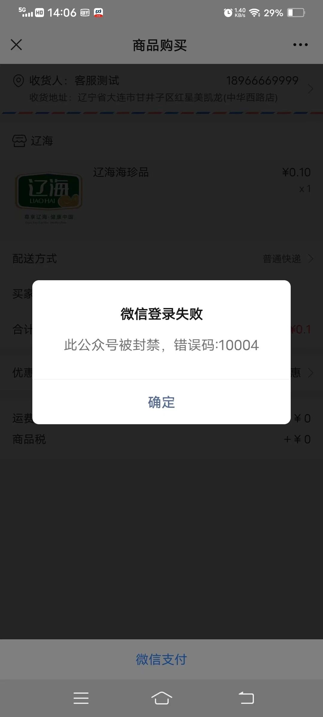 公众号做的账号迁移,然后再在第三方商城中换绑了公众号。第一次支付时,报错“此公众号被封禁,错误码10004”;公众号重置了密钥后,再支付时报错“此公众号并没有这些scope的权限,错误码:10005”