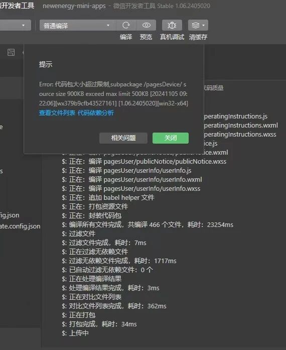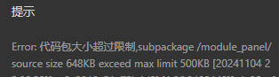 真机预览提示: Error: 代码包大小超过限制,subpackage /module_A/ source size 648KB exceed max limit 500KB [20241104 23:08:32