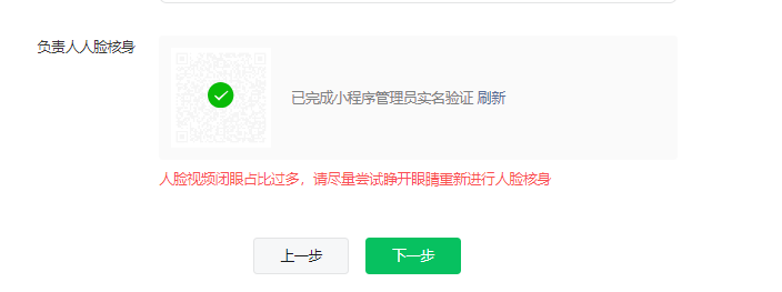 提交小程序备案,做小程序管理员(小程序负责人)人脸核身,人脸识别几十次,现实已经完成小程序管理员实名核验,提交都提示人脸视频闭眼占比过多无法提交