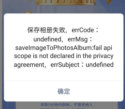 出现这个报错是因为你的小程序使用到了wx.saveImageToPhotosAlbum隐私接口,但是没有[mp后台 -> 设置 -> 服务内容声明 -> 用户隐私保护指引]中声明收集这个接口对应的隐私类型【使用你的相册(仅写入)权限】。
